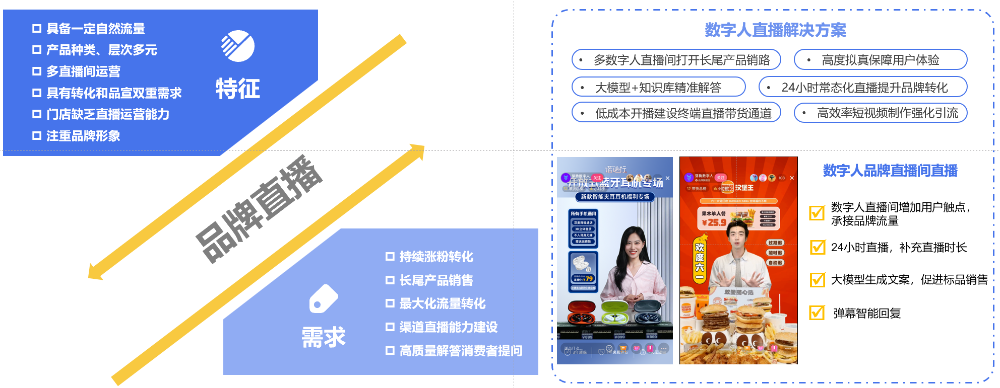 随着消费者注意力资源进一步分散,消费者在单一内容上停留时长不断缩短,已缩减至约30-40秒左右。数字人直播能够实现长时间、不间断内容输出,帮助商家吸引流量。而且数字人直播不受直播间场域限制,不受主播语言、能力与精力限制,能够适用于海内外不同平台、不同地域、不同品类的直播,能帮助品牌和产品更广泛的传播。