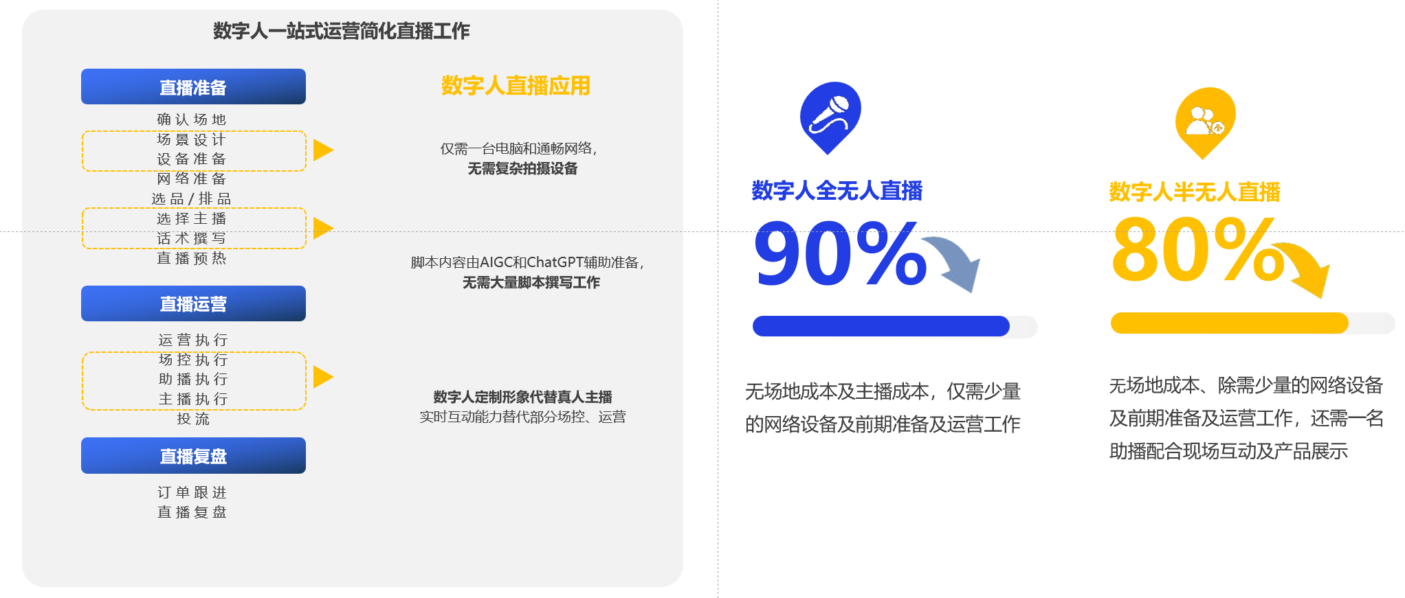 对众多中小商家,特别是产业带商家来说并没有足够的资源和财力支持直播增量的挖掘。数字人直播简化运营流程,无需场地准备、设备准备;无需真人出境,仅需企业投入部分人力作为直播间场控和运营,而且凭借万元以下的价格以及6小时以内的制作时间,数字人大幅降低了产业带中小商家展开直播业务的门槛。