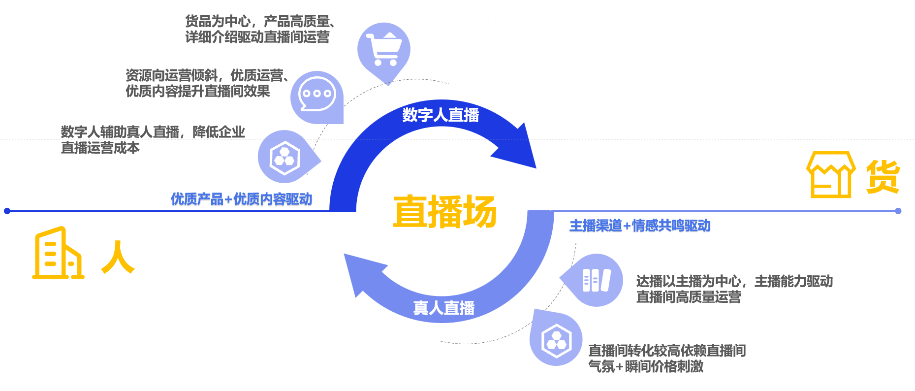 传统直播带货模式以主播为中心,通过主播个人魅力/能力,提升直播间带货效果,它的核心是以“人带货“的逻辑运作;数字人直播时,用数字人替代主播,将影响直播效果的因素从主播转移到货品和内容中,从而形成“货带人”逻辑,以高质量的产品和高质量的内容驱动直播间转化,推动品牌和商家将关注点从营销回归货品本身。